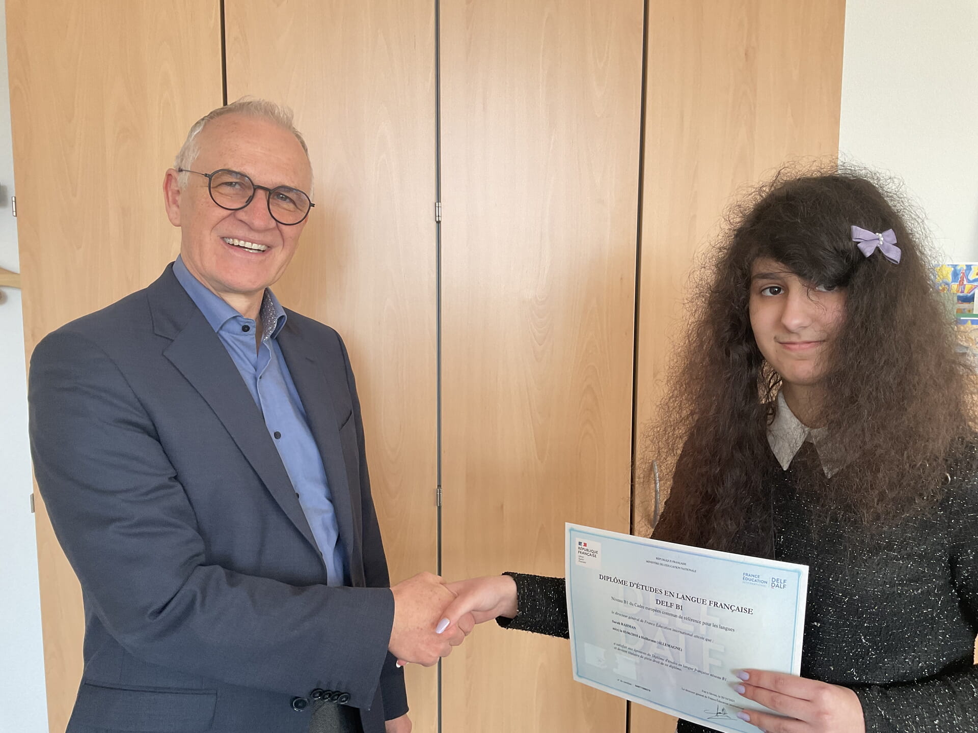 Pünktlich vor den Weihnachtsferien konnten Sarah Rahman (Klasse 10) und eine weitere Schülerin der Jahrgangsstufe 1 (Datenschutz) ihr DELF-Diplom in den Händen halten. Die beiden bereiteten sich im vergangenen Schuljahr im Rahmen der DELF-Ag auf die umfangreiche schriftliche und mündliche Prüfung auf B1-Niveau vor, die sie im Sommer dann gekonnt meisterten.