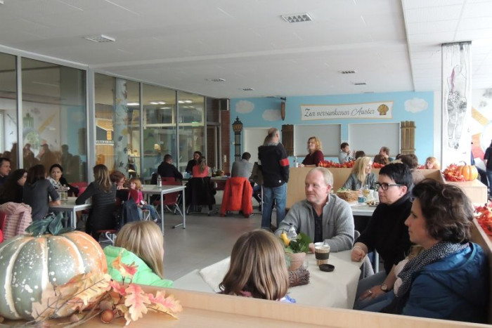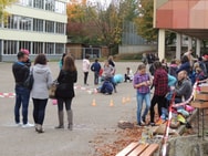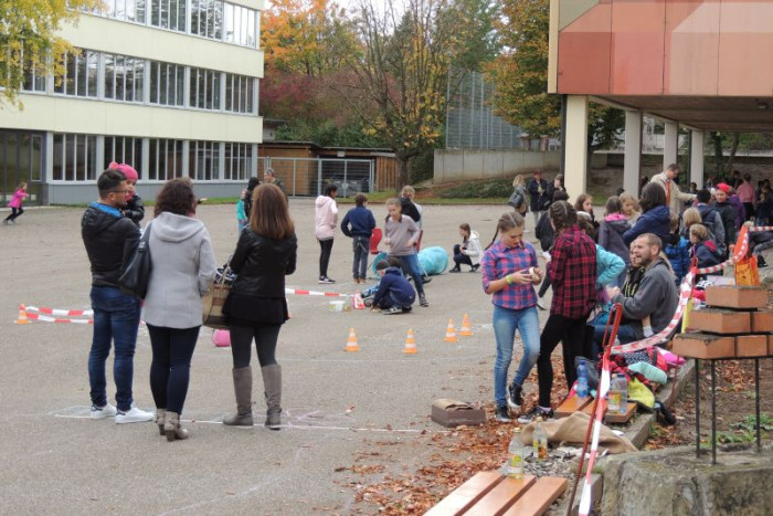 Bei unerwartet trockenem Wetter toben sich nach der Bühnenshow die Schüler auf der Spielstraße im Schulhof aus oder hangeln sich durch den Bewegungsparcours, und die Eltern und Großeltern der neuen Fünftklässler genießen das verführerische Angebot an süßen und salzigen Kuchen im wunderschön herbstlich dekorierten Aufenthaltsraum, und bei Kaffee oder Tee können sich die Eltern der neuen Klassen zwanglos kennenlernen oder auch durch das Schulhaus schlendern.