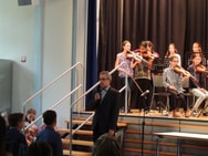 In zwei Blöcken unterhalten die 6. Klassen mit ihrem bunten Bühnenprogramm die vielen Gäste, die die Mensa beide Male an diesem Nachmittag füllen. Das Streichorchester begleitet das eher nachdenklich stimmende Lied „Hörst du, wie die Weltuhr tickt“, und für die beiden Sängerinnen ist es schon eine Herausforderung, vor einem so großen Publikum zu stehen.